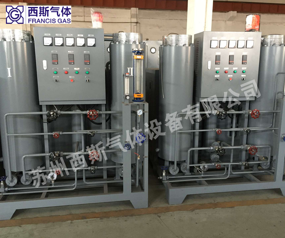 純化裝置主要有除氧器(對氣氛含氧量有特殊要求的客戶選用)、冷卻器、分子篩吸附干燥器和閥門組、電氣控制等組成。純化裝置有兩只分子篩吸附干燥器,兩只分子篩吸附干燥器循環(huán)使用,其中一只在吸附雜質(zhì)時,另一只在脫附排放雜質(zhì)。分子篩吸附脫除氣體中的水和殘氨后,氣體中的雜質(zhì)含量均小于1PPm。